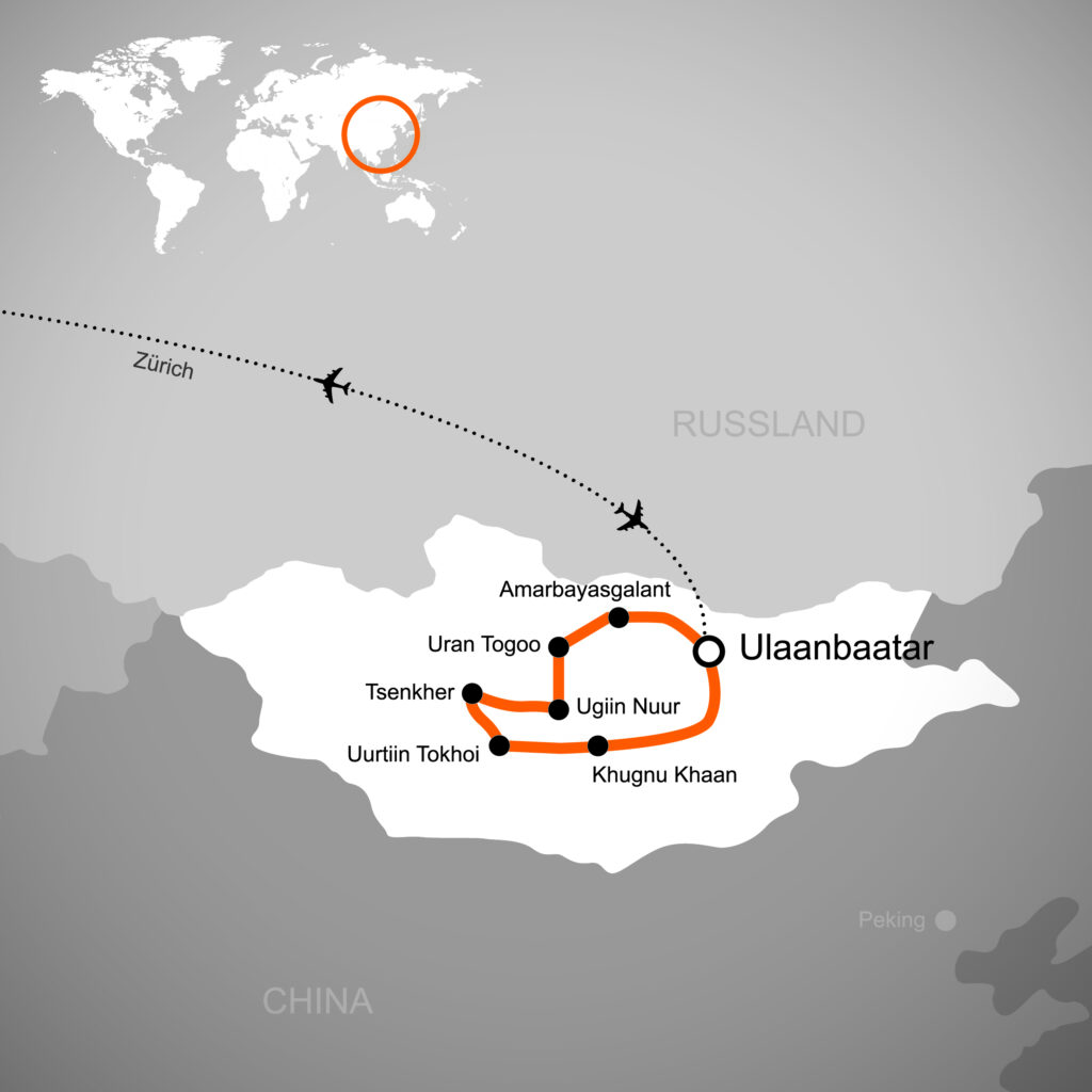 Grüne Steppen, sanfte Hügel, Sanddünen, weit verstreute Jurten, Wälder und Seen prägen die unberührte Landschaft dieses wahrhaft grossartigen Landes. Begegnungen mit Nomaden, die mit ihren unzähligen Tierherden durchs Land ziehen, werden jeden in die Zeit von Dschingis Khan versetzen. Der ökologische Reichtum, die eindrückliche Vulkanlandschaft, das karge aber zufriedene Nomadenleben und der Aufenthalt unter freiem Sternenhimmel bei Lagerfeuer wird für alle Teilnehmer*innen zu einem unvergesslichen Erlebnis. Das Gefühl von Freiheit mit einem Hauch Abenteuer wird uns nicht mehr loslassen, wenn wir in die Welt Dschingis Khans eintauchen.